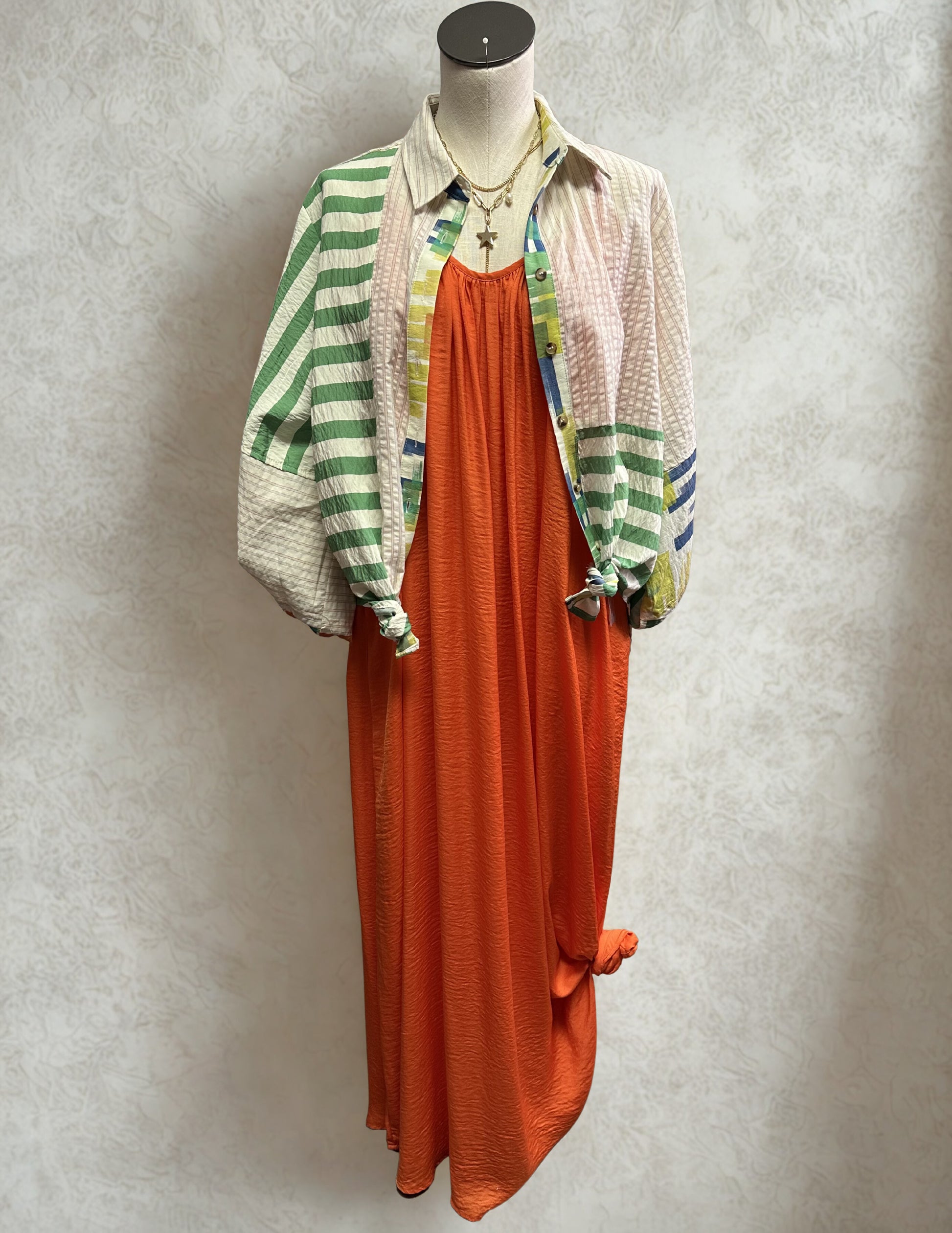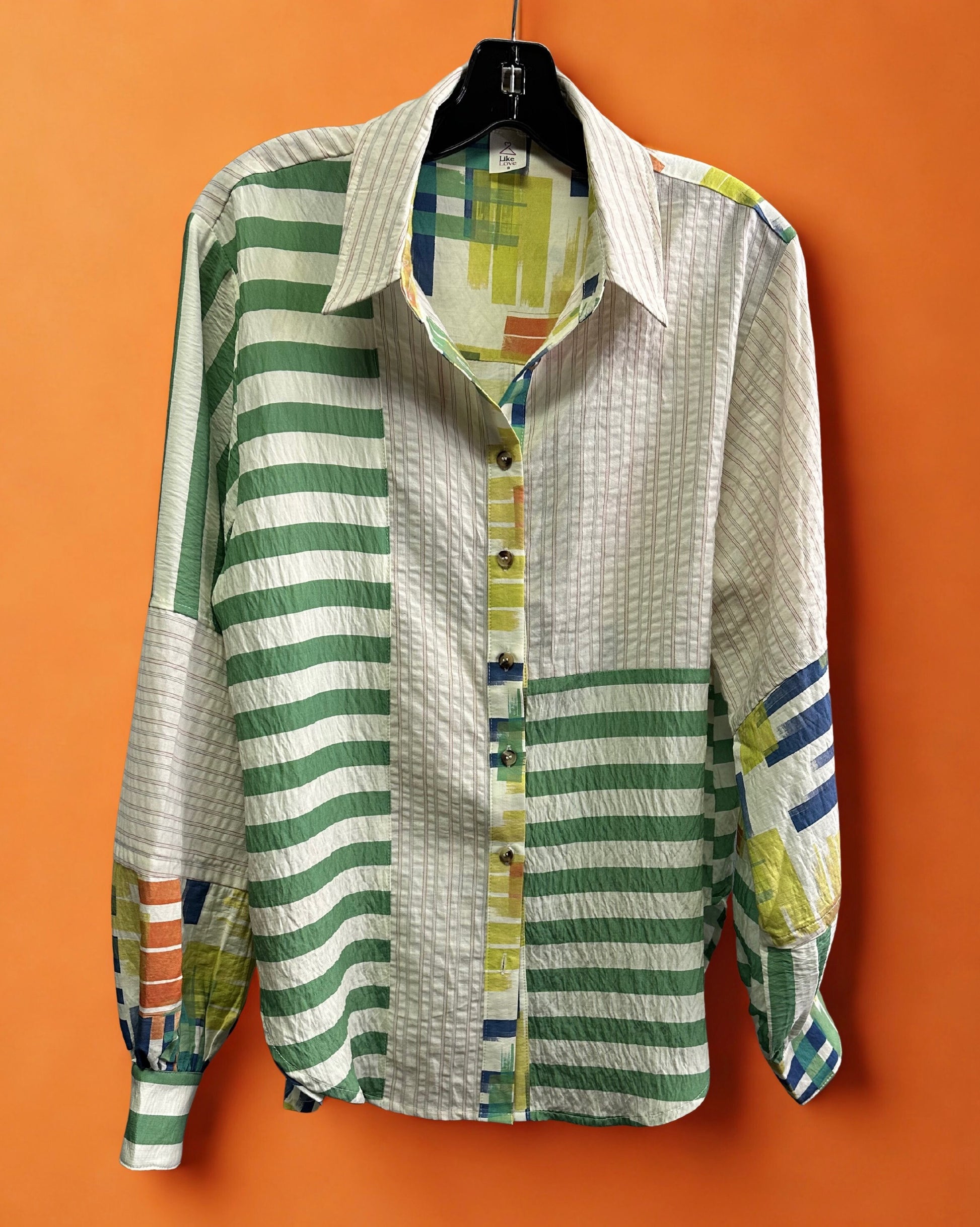 Make a statement from every angle. This long sleeve button-down features a bold green and orange abstract design across the back, giving it an unexpected artistic edge. The front keeps it classic with soft cream tones and subtle stripe detailing for a polished contrast. Lightweight and easy to style, it’s the perfect blend of structured and standout.