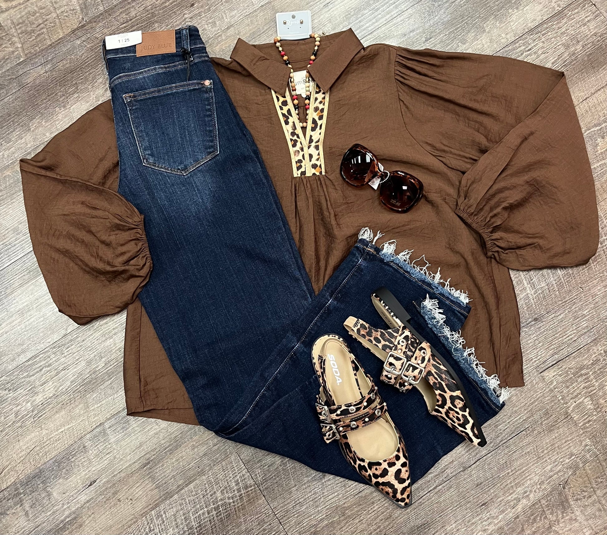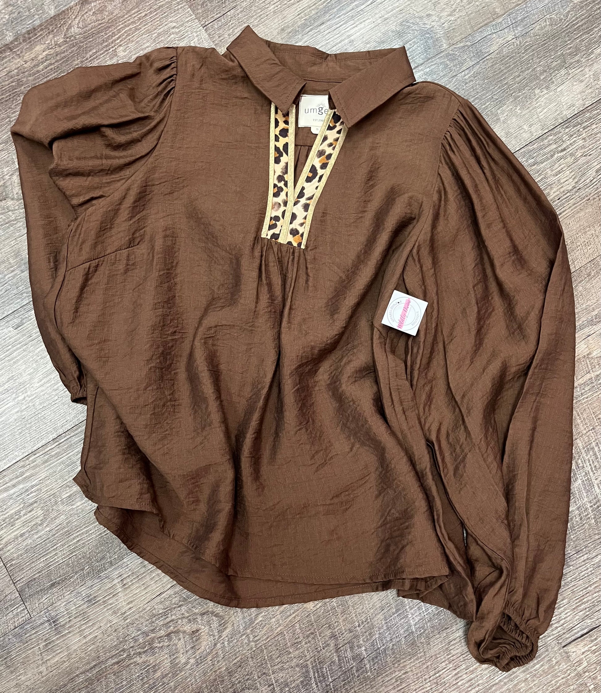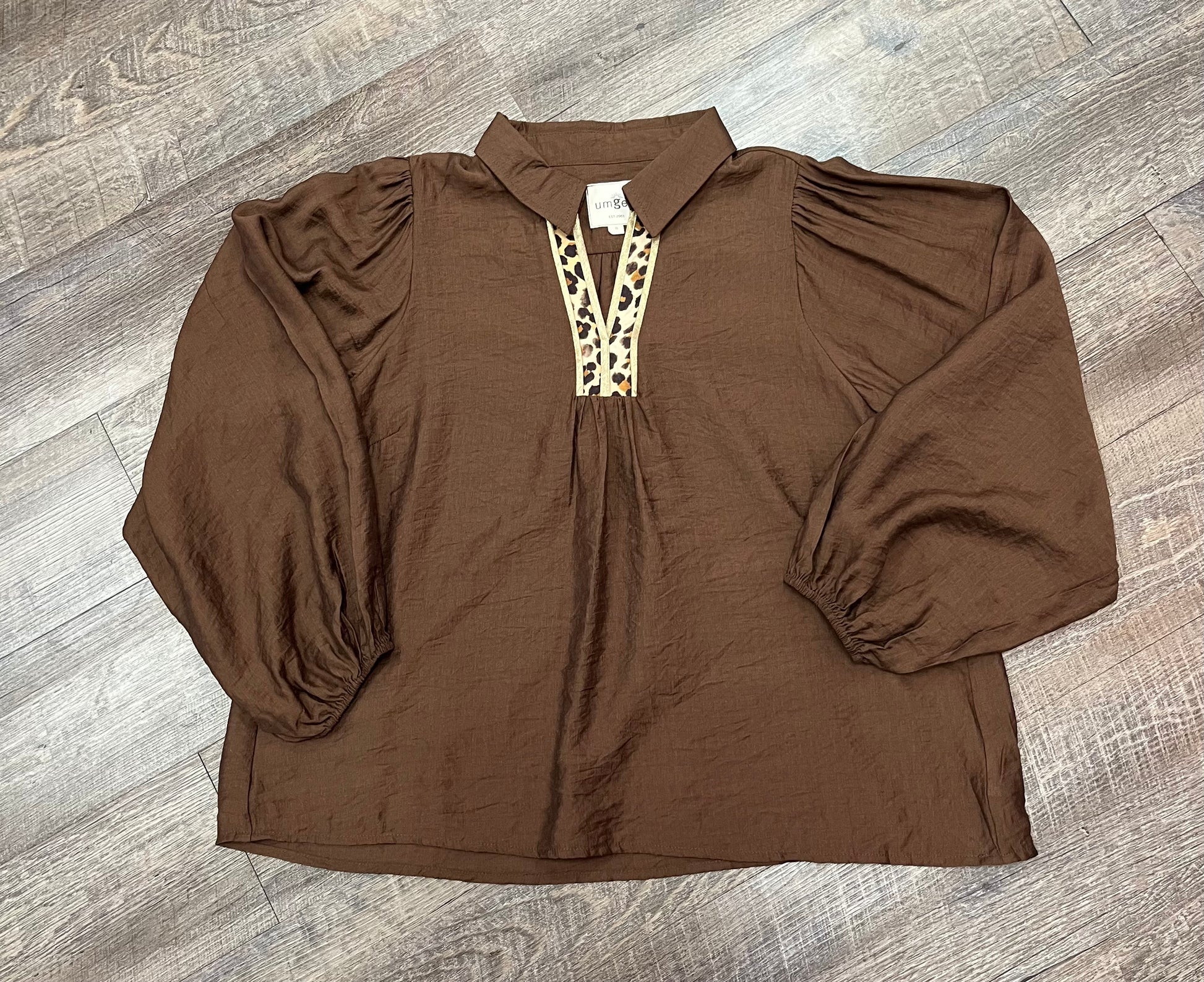 The wealthy feel of shimmery bronzed chocolate fabric with a touch of leopard print to add flare to this luxurious, balloon sleeved top.