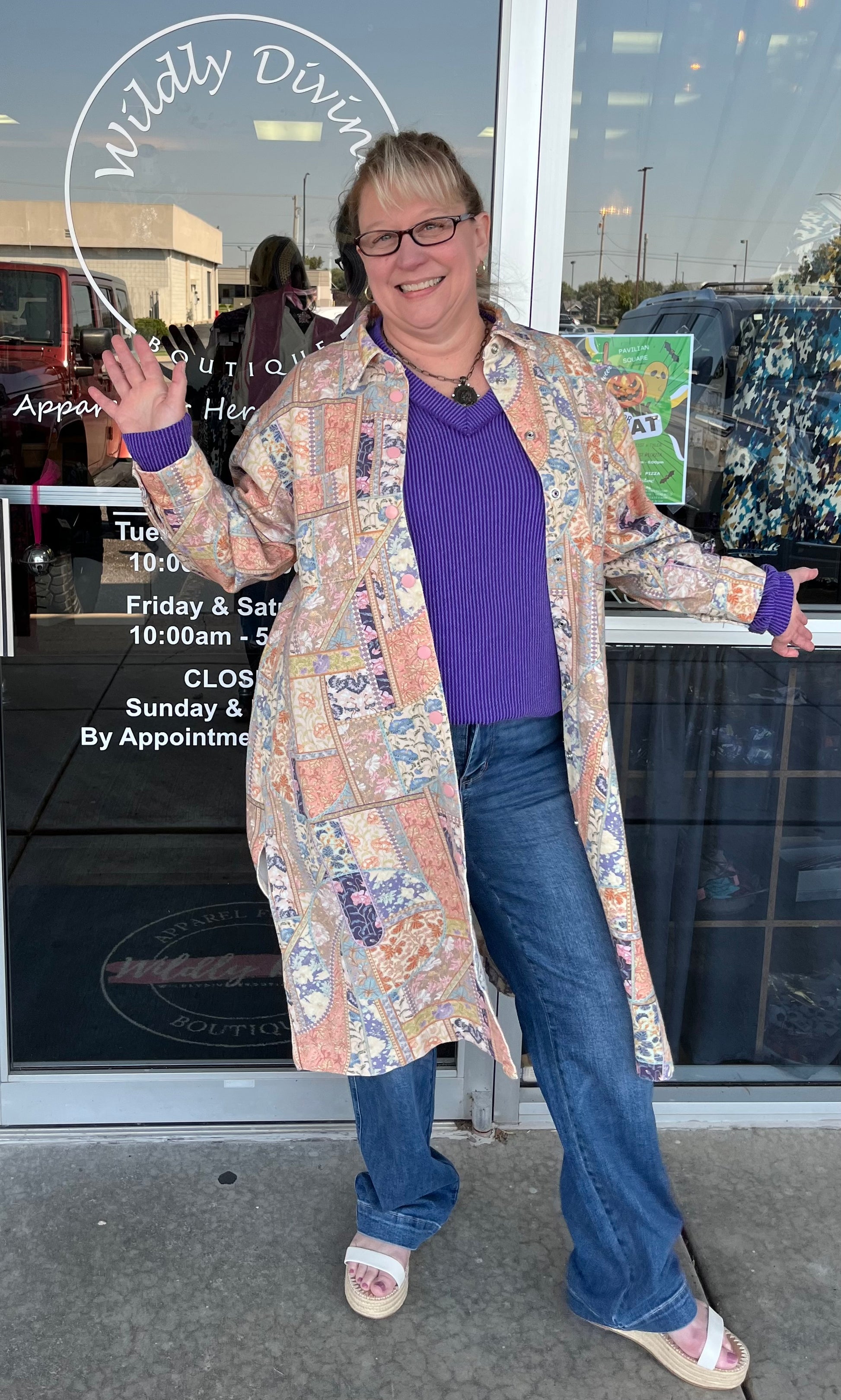 A free-spirited layer you’ll reach for all season long! This garment-washed denim shacket features a unique boho-inspired print that adds a touch of wanderlust to any outfit. Designed with a classic shirt collar, button front, and side slits for easy movement, it’s the perfect mix of laid-back and chic. Wear it open over your favorite basics or buttoned as a lightweight jacket for effortless boho vibes.