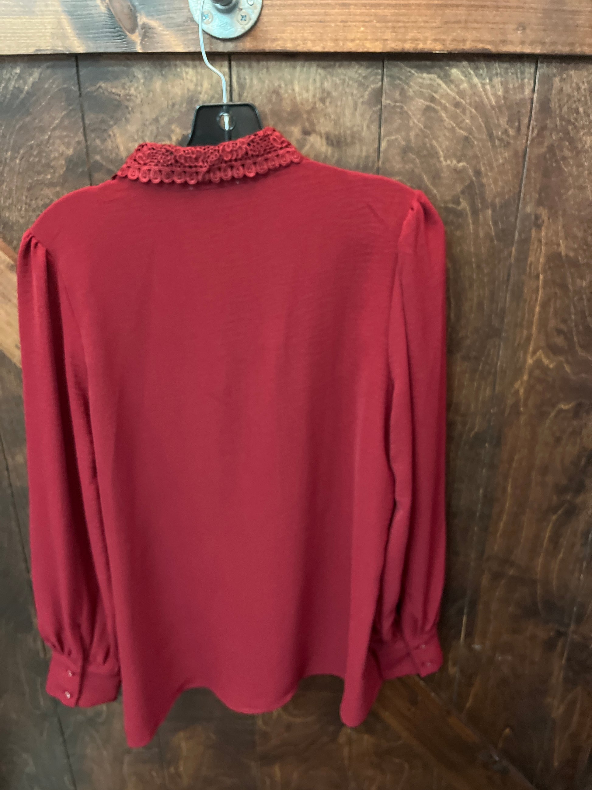 Lace collared top by first love. It’s 95 percent polyester and 5 percent spandex