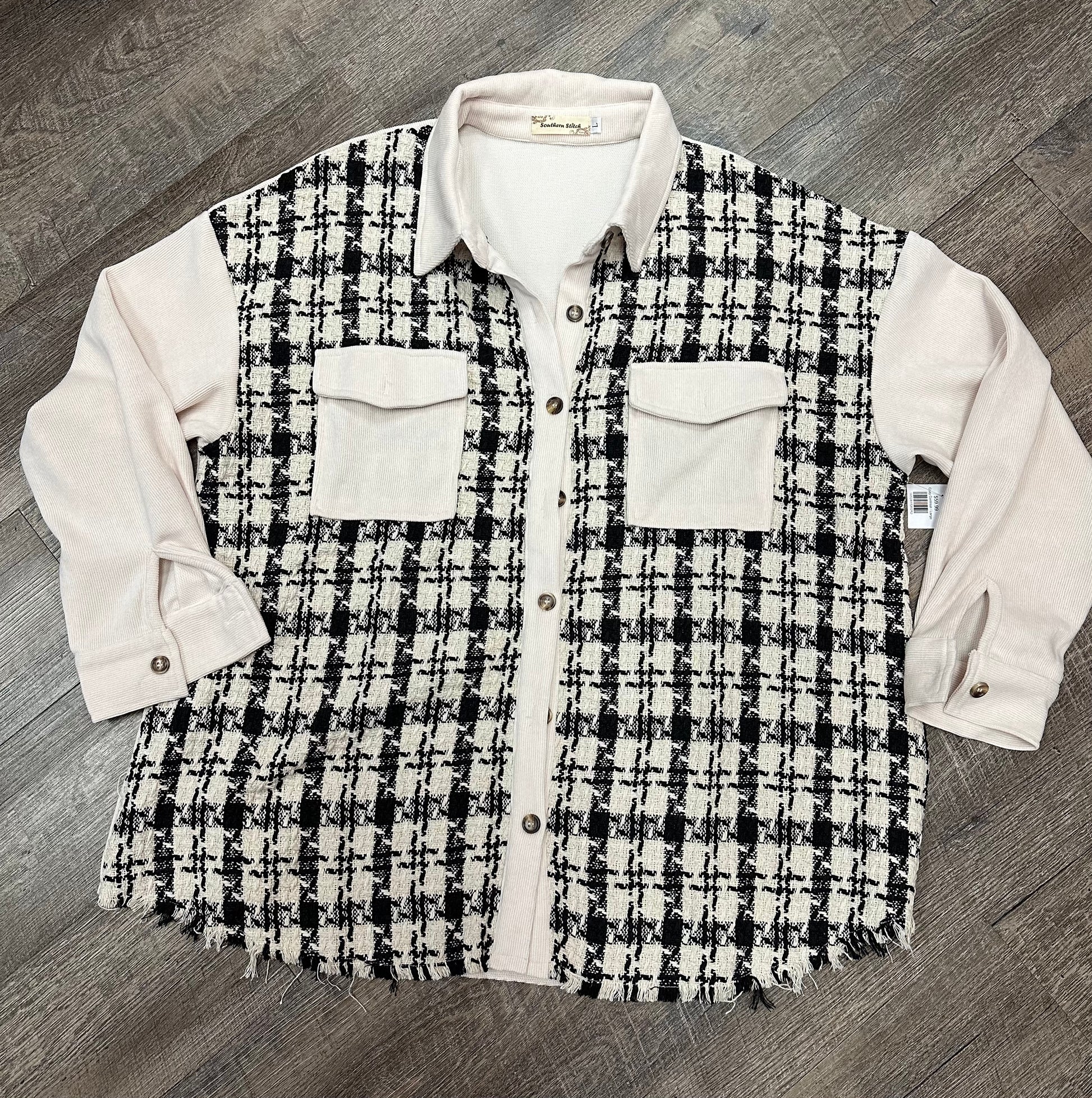 A soft and cozy shacket for those cooler days ahead. Add a pop of color or stay true to black and cream for a classic look. Shacket runs true to size (so grab the size you'd normally wear in a jacket).