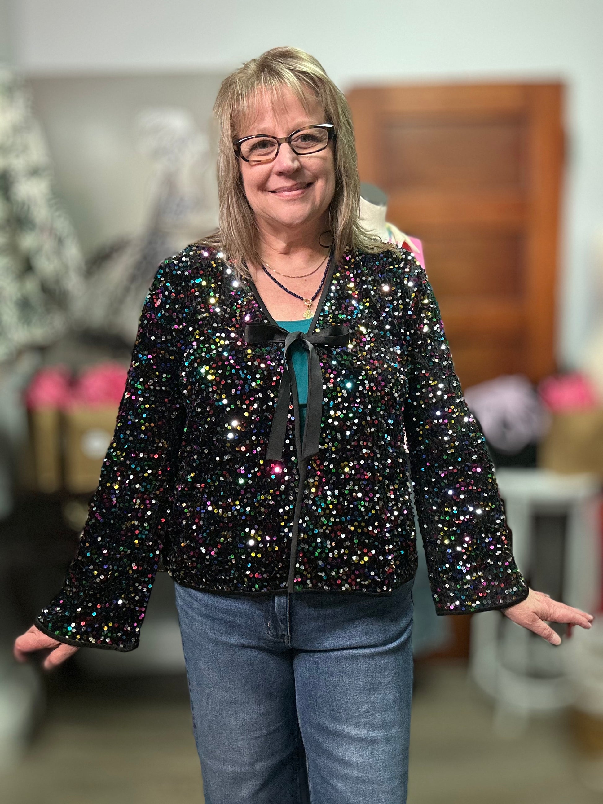 Get ready to shine on the dance floor in the Dazzling Discos Jacket! This sequin showstopper features long sleeves and a chic single bow tie front for the perfect mix of glam and playful charm. Whether you’re headed to a party, concert, or just want to sparkle up your everyday style, this jacket guarantees all eyes on you.