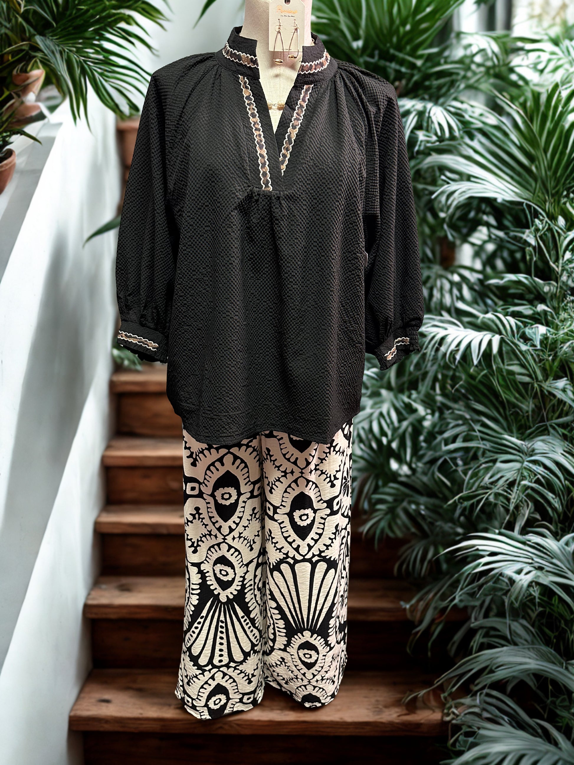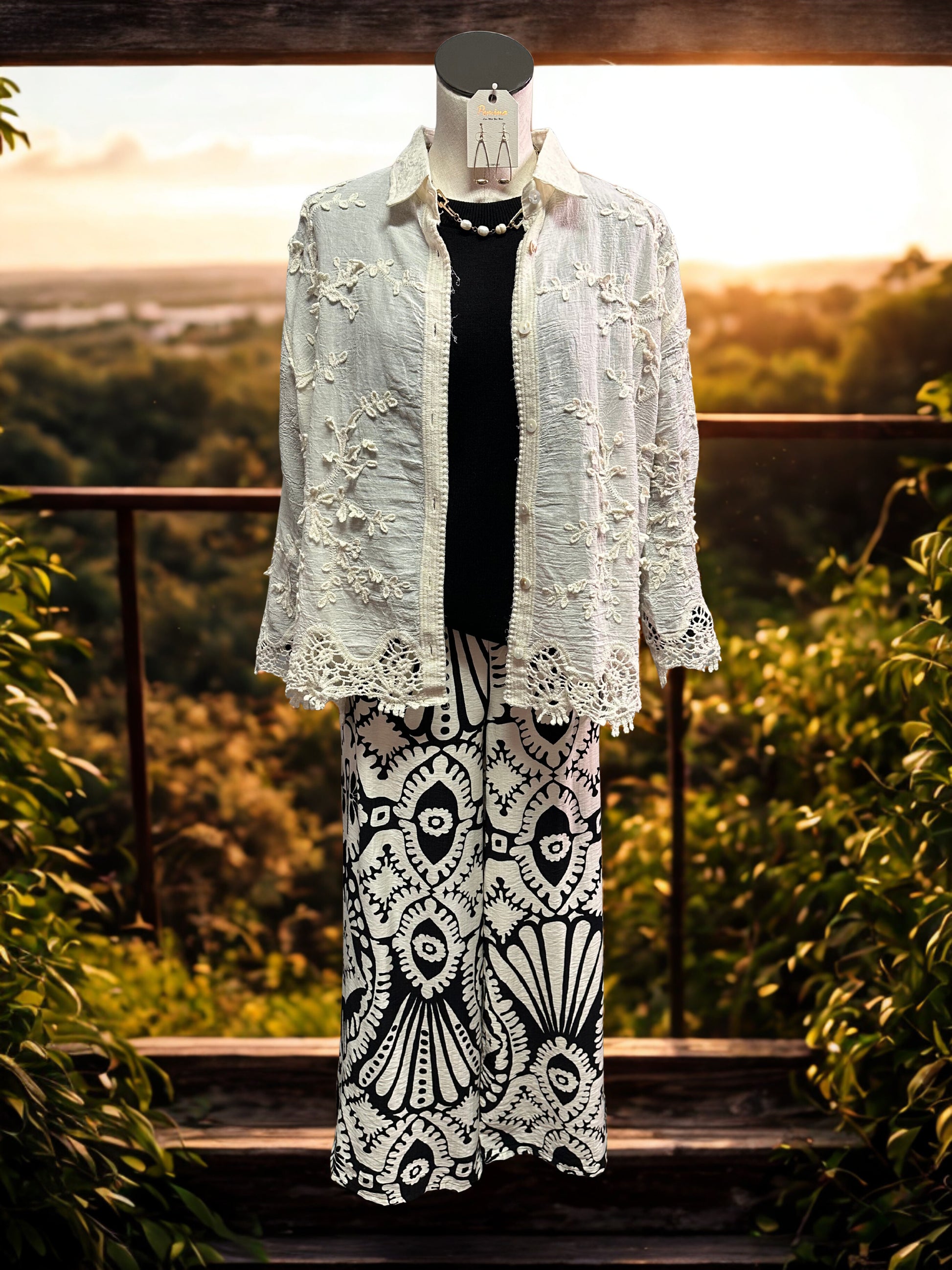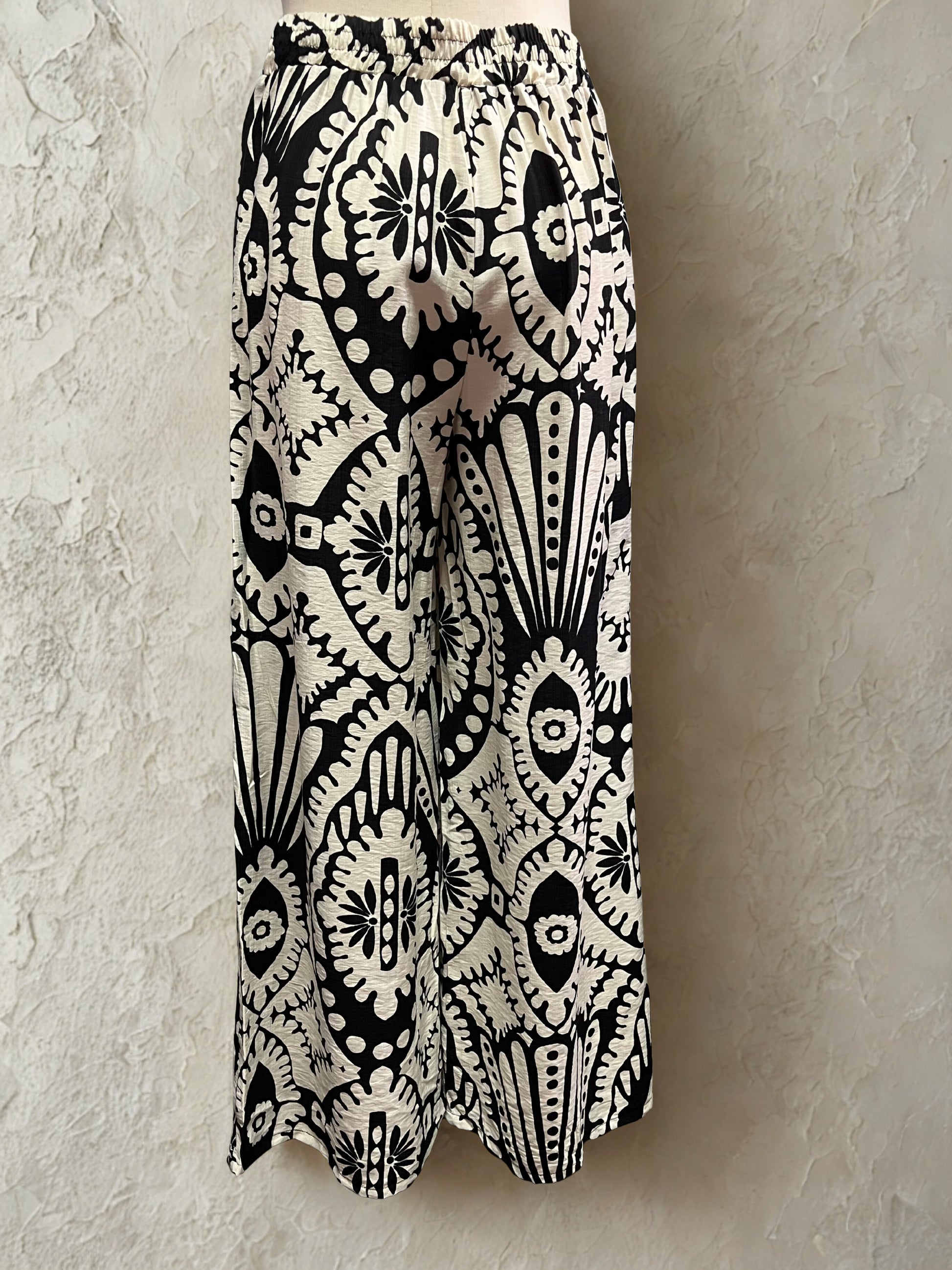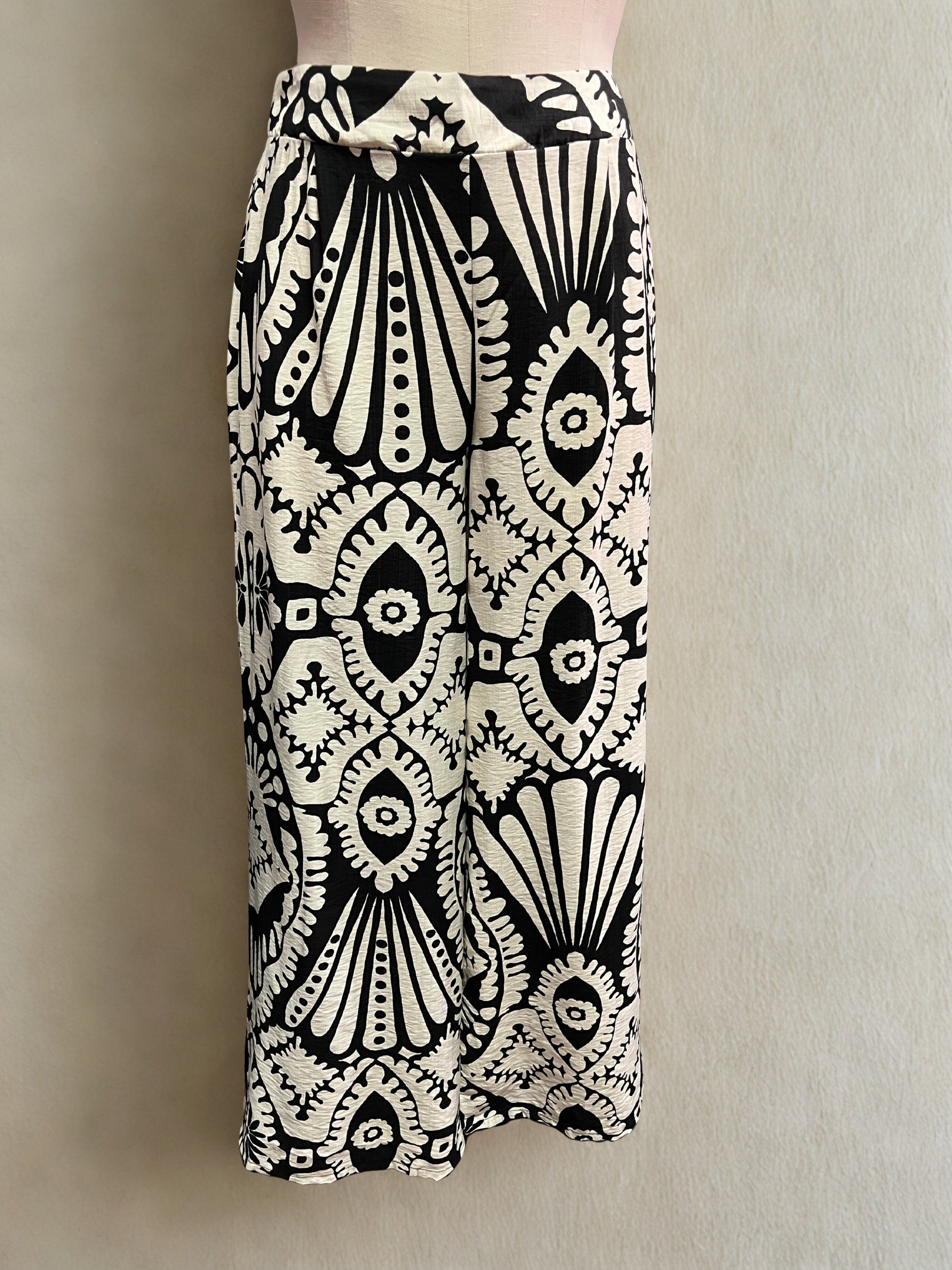 Wide leg palazzo pants are great for transitioning seasons. These black and ivory linque motif palazzo pants are just what Mother Nature called for. With a flat front waist band, and elastic in the back. These pants will fits a variety of shapes. Grab a pair today!