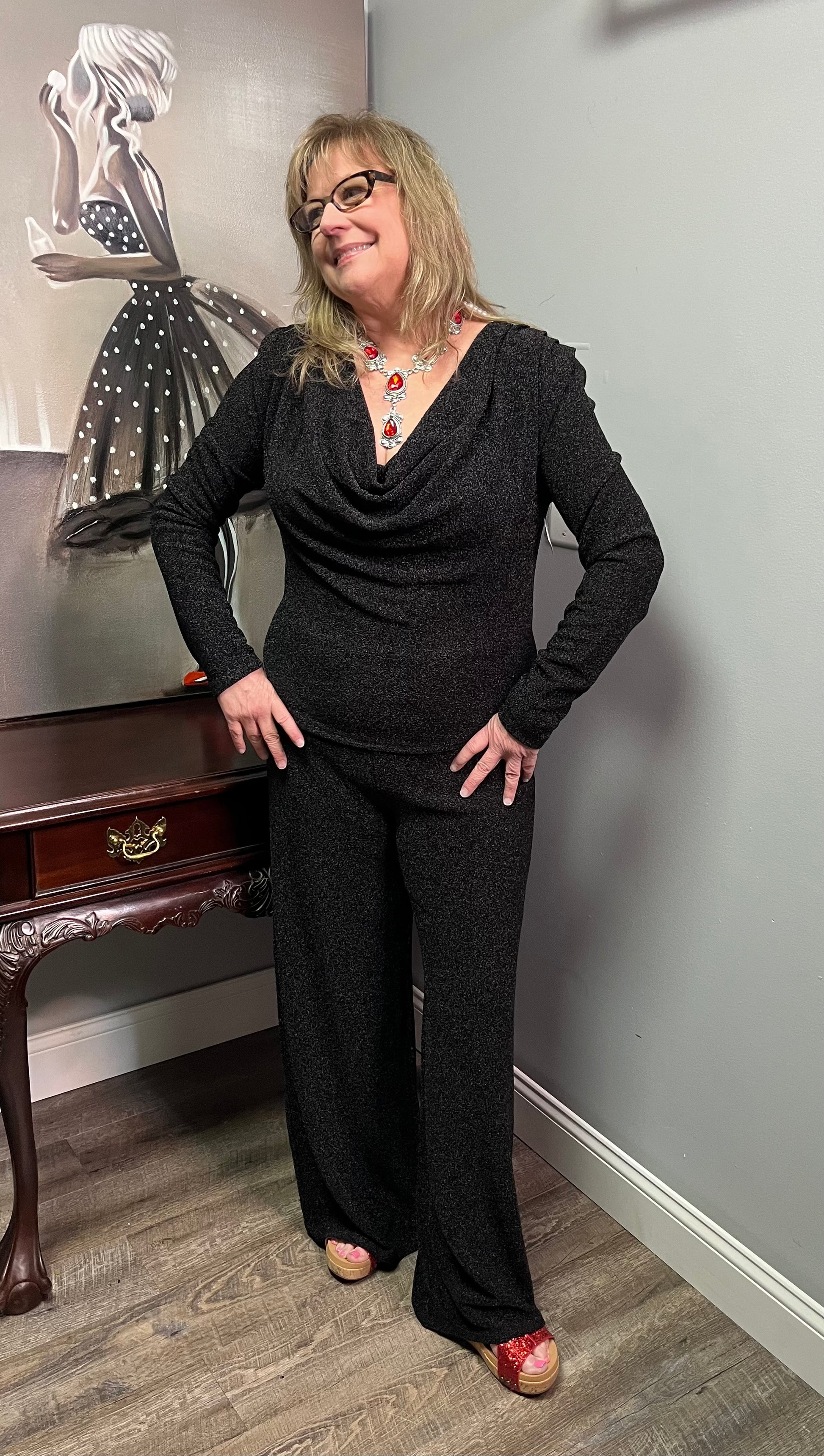 This stunning ensemble was made to turn heads. The shimmery cowl-neck top drapes beautifully, catching the light with every movement for an effortlessly radiant look. Paired with flowing wide-leg pants that create a long, elegant silhouette, this outfit exudes timeless sophistication. Perfect for evenings out, holiday events, or any occasion that calls for a touch of glamour and poise.