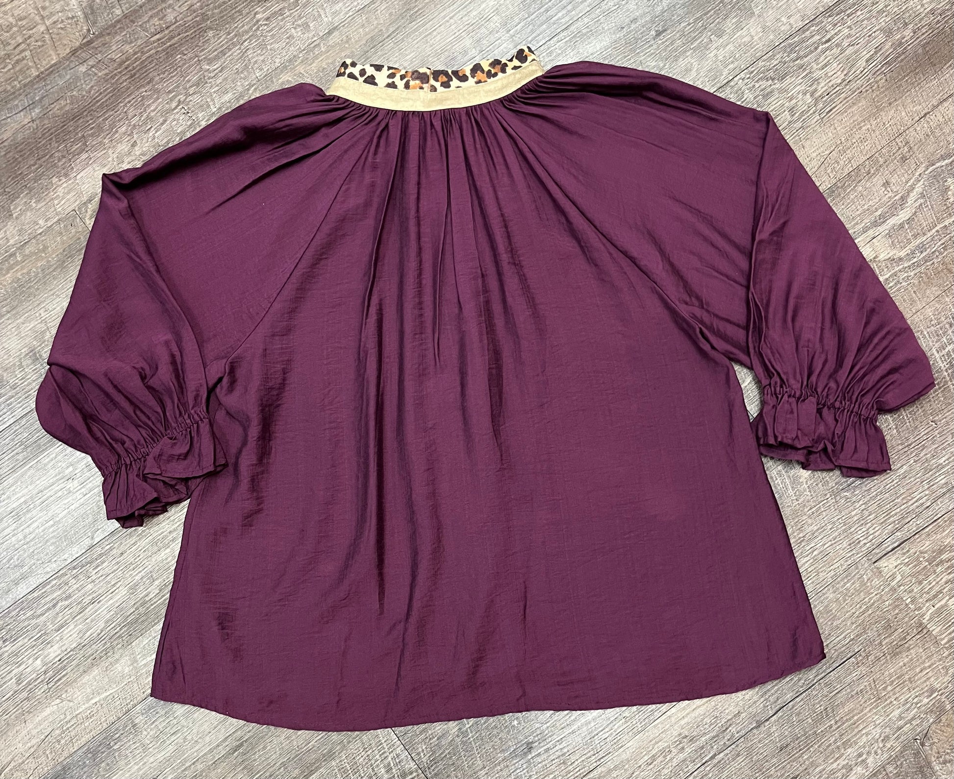 Can't get enough leopard print! This deep plum top is accented with a placket front with faux buttons and a scalloped leopard trim. Just the right touch of print to make this top stand out.